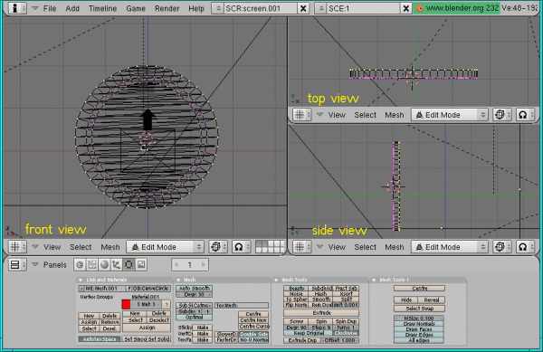 Click tab to get into edit mode, then a to select all points, next e to extrude and s to scale it a little bit in front view. Go to the edit button, press "new" and "select", then go to the material button, press "add new" and move the colour sliders to R=1, G=0,B=0, then go to the texture button, press "add new" and then "none". Then go back to the edit button and click "assign".